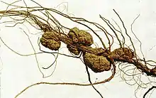 The large growths on these roots are galls induced by Agrobacterium sp.