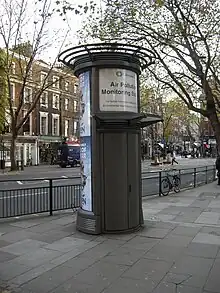 Unlike low-cost monitors, which are carried from place to place, static monitors continuously sample and measure the air quality in a particular, urban location. Public places such as busy railroad stations sometimes have active air quality monitors permanently fixed alongside platforms to measure levels of nitrogen dioxide and other pollutants.[14] Some static monitors are designed to give immediate feedback on local air quality. In Poland, EkoSłupek air monitors measure a range of pollutant gases and particulates and have small lamps on top that change colour from red to green to signal how healthy the air is nearby.[15]