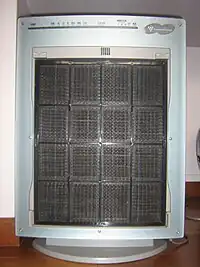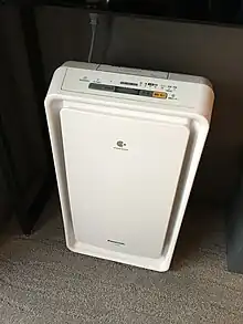 Other aspects of some air cleaners are hazardous gaseous by-products from ozone-generating units,[32] noise level, frequency of filter replacement, electrical consumption, and visual appeal. Ozone production is typical for air ionizing purifiers. A high concentration of ozone is dangerous, although most air ionizers produce low amounts, low rates of ozone reduce the effectiveness. A build up can cause detrimental health effects especially for vulnerable people.[33] The noise level of a purifier can often be obtained through a customer service department and is usually reported in decibels (dB). The noise levels for most purifiers can vary and may be dependent on fan speed.[34] Frequency of filter replacement and electrical consumption are the major operation costs for any purifier. There are many types of filters; some can be cleaned by water, by hand or by vacuum cleaner, while others need to be replaced every few months or years.[35] Sometimes suitable filters are only sold by the manufacturer for a high cost, some have DRM control so only replacement filters authorised by the manufactuere can be used.[36] In the United States, some purifiers are certified as Energy Star and are energy efficient.