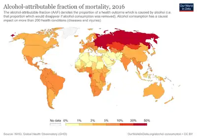 3.6% of all cancer cases and 3.5% of cancer deaths worldwide are attributable to consumption of alcohol (specifically, acetaldehyde a derivative of ethanol).[3]