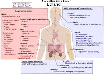 Alcoholism, also known as alcohol use disorder (AUD),[1] is, broadly, any drinking of alcohol that results in mental or physical health problems.[14][2][4] The disorder was previously divided into two types: alcohol abuse and alcohol dependence.[2][15] In a medical context, alcoholism is said to exist when two or more of the following conditions are present: a person drinks large amounts of alcohol over a long time period, has difficulty cutting down, acquiring and drinking alcohol takes up a great deal of time, alcohol is strongly desired, usage results in not fulfilling responsibilities, usage results in social problems, usage results in health problems, usage results in risky situations, withdrawal occurs when stopping, and alcohol tolerance has occurred with use.[2] Alcohol use can affect all parts of the body, but it particularly affects the brain, heart, liver, pancreas and immune system.[4][5] Alcoholism can result in mental illness, delirium tremens, Wernicke–Korsakoff syndrome, irregular heartbeat, an impaired immune response, liver cirrhosis and increased cancer risk.[4][5][16] Drinking during pregnancy can result in fetal alcohol spectrum disorders.[3] Women are generally more sensitive than men to the harmful effects of alcohol, primarily due to their smaller body weight, lower capacity to metabolize alcohol, and higher proportion of body fat.[11]