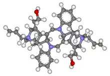 Alcuronium chloride (formerly marketed as Alloferin) is a neuromuscular blocking (NMB) agent, alternatively referred to as a skeletal muscle relaxant. It is a semi-synthetic substance prepared from C-toxiferine I,[1] a bis-quaternary alkaloid obtained from Strychnos toxifera. C-toxiferine I itself has been tested for its pharmacological action and noted to be a very long acting neuromuscular blocking agent[2] For a formal definition of the durations of actions associated with NMB agents, see page for gantacurium. The replacement of both the N-methyl groups with N-allyl moieties yielded N,N-diallyl-bis-nortoxiferine, now recognized as alcuronium.