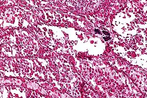 Micrograph of an alveolar soft part sarcoma, showing the characteristic alveolar-like architecture and cells with eccentric nuclei and abundant eosinophilic cytoplasm. H&E stain. | |