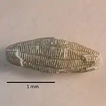 Alveolinidae is a family of spheroidal to fusiform milioline foraminifera with multiple apertures and complex interiors in which chambers are subdivided into chamberlets and subfloors interconnected by passageways. As with all Miliolina, the test wall in alveolinids is porcellaneous and imperforate. In living individuals the pseudopodia emerge through the multiple apertures that line the apertural or leading face of the test.
