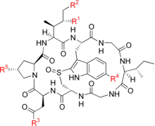 The compounds have a similar structure, that of eight amino-acid residues arranged in a conserved macrobicyclic motif (an overall pentacyclic structure when counting the rings inherent in the proline and tryptophan-derived residues); they were isolated in 1941 by Heinrich O. Wieland and Rudolf Hallermayer.[2] All amatoxins are cyclic peptides that are synthesized as 35-amino-acid proproteins, from which the final eight amino acids are cleaved by a prolyl oligopeptidase.[3] The schematic amino acid sequence of amatoxins is Ile-Trp-Gly-Ile-Gly-Cys-Asn-Pro with cross-linking between Trp and Cys via the sulfoxide (S=O) moiety and hydroxylation in variants of the molecule; enzymes for these processings steps remain unknown.