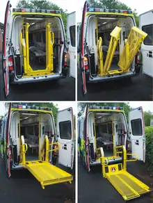 • Tail lift or ramp – Ambulances can be fitted with a tail lift or ramp in order to facilitate loading a patient without having to undertake any lifting. This is especially important where the patient is obese or specialty care transports that require large, bulky equipment such as a neonatal incubator or hospital beds. There may also be equipment linked to this such as winches which are designed to pull heavy patients into the vehicle.[54]