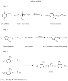 One of the first amitraz-manufacturing plants used this reaction scheme (figure 1).[5] Therefore, the reactions has been carried out in an enclosed area, to recycle unused reagents.[5] The first step of this route is the reaction of an aniline with triethyl orthoformate. In the named manufacturing plant 2,4-Xylidine has been used as the aniline.[7] The reaction yields an intermediate formimidate ester.[5][7] In the next step methylamine is added, which combines with the formimidate ester to yield the desired formamidine.[5][7] As the formamidines forms, ethanol is set free from the chemical reaction and is recycled.[5] This is probably the most suitable method for the synthesis of amitraz, because this second step yields N′-2,4-dimethyl-N-methylformamidine. The free -NH groups of these molecules react with each other to finally yield amitraz.[5] The last steps of the manufacturing process include crystalisation out from isopropyl alcohol, filtering and drying. These last steps need to be carried out by instructed personnel, who wear full protective clothing with a positive-pressure breathing apparatus.[5][7]