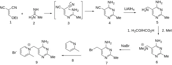 Condensation of ethoxymethylenemalononitrile (1) with acetamidine (2) affords the substituted pyrimidine (4). The reaction may well involve conjugate addition of the amidine nitrogen to the malononitrile followed by loss of ethoxide (3); addition of the remaining amidine nitrogen to one of the nitriles will then lead to the pyrimidine (4). Reduction of the nitrile gives the corresponding aminomethyl compound (5). Exhaustive methylation of the amine followed by displacement of the activated quaternary nitrogen by bromide ion affords the key intermediate (7). Displacement of the halogen by α-picoline gives amprolium.