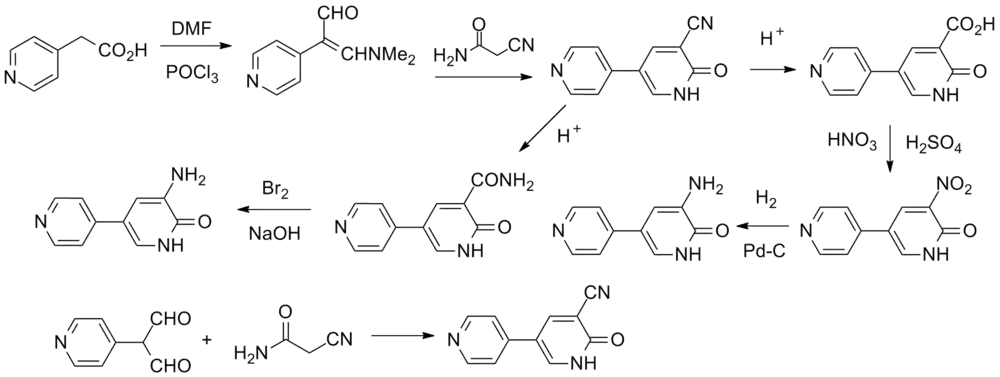 - ↑ GB 2070008, Gelotte KO, Parady ED, "Process for preparing 5-cyano(3,4'-bipyridin)-6(1H)-one", published 3 September 1981, issued 18 April 1984, assigned to Sterling Drum Inc.