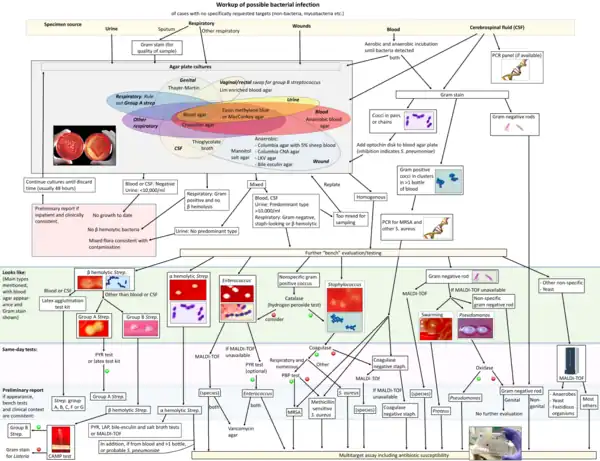 Example of a workup algorithm of possible bacterial infection in cases with no specifically requested targets (non-bacteria, mycobacteria etc.), with most common situations and agents seen in a New England community hospital setting. Multiple anaerobic growth media are mentioned among agar plate cultures. Anaerobes may also be identified by MALDI-TOF as shown at bottom right.