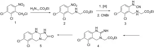 Condensation of benzyl chloride 1 with ethyl ester of glycine gives alkylated product 2. Reduction of the nitro group leads to the aniline and reaction of this with cyanogen bromide possibly gives cyanamide 3 as the initial intermediate. Addition of the aliphatic would then lead to formation of the quinazoline ring (4). Amide formation between the newly formed imide and the ester would then serve to form the imidazolone ring, whatever the details of the sequence, there is obtained anagrelide (5).