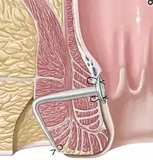• Cutting seton – if the fistula is in a high position and it passes through a significant portion of the sphincter muscle, a cutting seton (from the Latin seta, "bristle") may be used. This involves inserting a thin tube through the fistula tract and tying the ends together outside of the body. The seton is tightened over time, gradually cutting through the sphincter muscle and healing as it goes. This option minimizes scarring but can cause incontinence in a small number of cases, mainly of flatus. Once the fistula tract is in a low enough position it may be laid open to speed up the process, or the seton can remain in place until the fistula is completely cured. This was the traditional modality used by physicians in Ancient Egypt and formally codified by Hippocrates,[14] who used horsehair and linen.