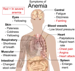 mad:Anèmia Anemia is a decrease in the total amount of red blood cells (RBCs) or hemoglobin in the blood,[3][4] or a lowered ability of the blood to carry oxygen.[5] When anemia comes on slowly, there may be no symptoms or vague symptoms such as feeling tired, weakness, shortness of breath, and a poor ability to exercise.[6][1] When the anemia comes on quickly, symptoms may include confusion, feeling like one is going to pass out, loss of consciousness, and increased thirst.[1] Anemia must be significant before a person becomes noticeably pale.[1] Additional symptoms may occur depending on the underlying cause.[1]