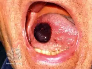 Angina bullosa haemorrhagica is a condition of the mucous membranes characterized by the sudden appearance of one or more blood blisters within the oral cavity.[1]: 808 The lesions, which may be caused by mild trauma to the mouth tissues such as hot foods, typically rupture quickly and heal without scarring or further discomfort.[2] The condition is not serious except in rare cases where a large bulla that does not rupture spontaneously may cause airway obstruction.