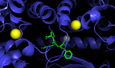 ACE is a zinc metalloproteinase.[13] The zinc center catalyses the peptide hydrolysis. Reflecting the critical role of zinc, ACE can be inhibited by metal-chelating agents.[14]