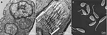 - ↑ Gadelha C, Wickstead B, de Souza W, Gull K, Cunha-e-Silva N (2005). "Cryptic paraflagellar rod in endosymbiont-containing kinetoplastid protozoa". Eukaryot Cell. 4 (3): 516–525. doi:10.1128/EC.4.3.516-525.2005. PMC 1087800. PMID 15755914.