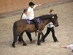 Therapeutic riding is used by disabled individuals who ride horses to relax, and to develop muscle tone, coordination, confidence, and well-being.[61] Equine-assisted psychotherapy (EAP) or Equine Facilitated Psychotherapy (EFP) is the use of equines to treat human psychological problems in and around an equestrian facility. The existing body of evidence does not justify the promotion and use of equine-related treatments for mental disorders.[62]