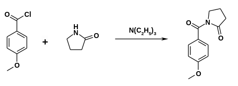 Alternatively, gamma-aminobutyric acid can react with anisoyl chloride. Ring closure can be accomplished in the presence of thionyl chloride.[19]