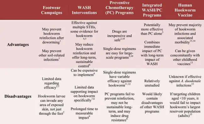 Evaluation of numerous public health interventions has generally shown that improvement in each individual component ordinarily attributed to poverty often have minimal impact on transmission. For example, one study found that the introduction of latrines into a resource-limited community only reduced the prevalence of hookworm infection by four percent.[53] However, another study in Salvador, Brazil found that improved drainage and sewerage had a significant impact on the prevalence of hookworm infection but no impact at all on the intensity of hookworm infection. This seems to suggest that environmental control alone has a limited but incomplete effect on the transmission of hookworms.[54]
