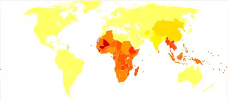 It is estimated that between 576 and 740 million individuals are infected with hookworm.[58][26] Of these infected individuals, about 80 million are severely affected.[38] The major cause of hookworm infection is N. americanus which is found in the Americas, sub-Saharan Africa, and Asia.[15] A. duodenale is found in more scattered focal environments, namely Europe and the Mediterranean. Most infected individuals are concentrated in sub-Saharan Africa and East Asia/the Pacific Islands with each region having estimates of 198 million and 149 million infected individuals, respectively. Other affected regions include: South Asia (50 million), Latin America and the Caribbean (50 million), South Asia (59 million), Middle East/North Africa (10 million).[26] A majority of these infected individuals live in poverty-stricken areas with poor sanitation. Hookworm infection is most concentrated among the world's poorest who live on less than $2 a day.[15]