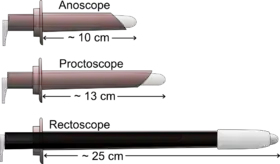 ![]() An anoscope, a proctoscope and a rectoscope, and their approximate lengths. | |