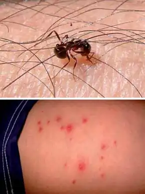 Of all extant ant species, about 71% are considered to be stinging species, as some subfamilies have evolutionarily lost the ability to sting.[1] Notable examples include a few species of medical importance, such as Solenopsis (fire ants), Pachycondyla, Myrmecia (bulldog ants), and Paraponera (bullet ants). In the case of fire ants, the venom consists mainly of alkaloid (>95%) and protein (<1%) components.[2] Stinging ants cause a cutaneous condition that is different from that caused by biting venomous ants. Particularly painful are stings from fire ants, although the bullet ant's sting is considered by some to be the most painful insect sting.[3]:450