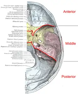 Base of skull. Superior view. Boundaries of the cranial fossae drawn as red lines.