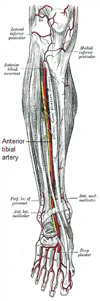 The anterior tibial artery is an artery of the leg. It carries blood to the anterior compartment of the leg and dorsal surface of the foot, from the popliteal artery.