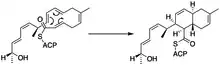 Anthracimycin is the product of a type I polyketide synthase (PKS). This modular synthetic pathway uses a trans-acyltransferase (AT) domain to load successive units of malonyl-CoA (MCoA) and methylmalonyl-CoA (MMCoA) to build the macrolide backbone. The synthesis is composed of 10 biosynthetic modules consisting of the typical domains associated with PKS biosynthetic pathways (See Figure 1). Formation of the decalin ring is part of the PKS pathway and not a post-tailoring event. This occurs via a spontaneous [4+2] cycloaddition after module 8 (See Figure 2). Cyclization to form the larger lactone ring is the final step of the process by the thioesterase domain.[3]