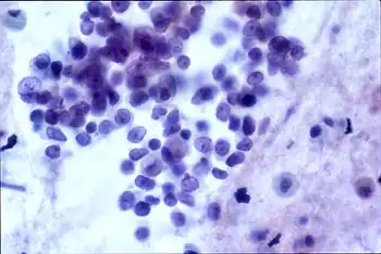 In people with cancer, the cancer has a likely role in the cause of the encephalitis. In a paraneoplastic syndrome, a cancer cell can create proteins that are normally only found as naturally-occurring proteins in other cell types in other parts of the body. In patients with small cell carcinoma of the lung, cancer cells in the lung can produce Hu proteins that are usually only found inside of the body's own neurons. It is hypothesized that through these cancer-produced Hu proteins, the body creates an immune system response. This reaction includes T cells, which then attack nervous tissue.[12] The cancer-produced Hu proteins are found in nearly all small-cell lung carcinomas, 70 percent of neuroblastomas, and a small percentage of other tumors.[13]