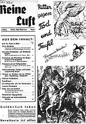 Well-known health magazines like the Gesundes Volk (Healthy People),[34] Volksgesundheit (People's Health) and Gesundes Leben (Healthy Life)[54] also published warnings about the health consequences of smoking[34][54] and posters showing the harmful effects of tobacco were displayed.[34] Some anti-smoking posters were unapproved and censured by the government.[9] Editorials discussing the issue of smoking and its effects were published in newspapers.[55] Articles advocating nonsmoking were also published in the magazines Die Genussgifte (The Recreational Stimulants), Auf der Wacht (On the Guard) and Reine Luft (Clean Air).[56] Out of these magazines, Reine Luft was the main journal of the anti-tobacco movement.[1][8] Karl Astel's Institute for Tobacco Hazards Research at Jena University purchased and distributed hundreds of reprints from Reine Luft.[8] The magazine was published by tobacco control activists; it was later, in 1941, ordered by the propaganda ministry to moderate its tone and submit all material for pre-approval.[9]