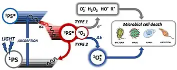 Antimicrobial photodynamic therapy (aPDT), also referred to as photodynamic inactivation (PDI), photodisinfection (PD), or photodynamic antimicrobial chemotherapy (PACT), is a photochemical antimicrobial method that has been studied for over a century.[1] Supported by in vitro, in vivo and clinical studies, aPDT offers a treatment option for broad-spectrum infections, particularly in the context of rising antimicrobial resistance.[2][3] Its multi-target mode of action allows aPDT to be a viable therapeutic strategy against drug-resistant microorganisms.[4] The procedure involves the application of photosensitizing compounds, also called photoantimicrobials, which, upon activation by light, generate reactive oxygen species (ROS). These ROS lead to the oxidation of cellular components of a wide array of microbes, including pathogenic bacteria, fungi, protozoa, algae, and viruses.[5]