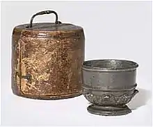 Roman banquets of antiquity had goblets of specially prepared antimony-doctored wine. The antimonial cup would be employed in order to facilitate repeated doses of overeating by a followup of purging.[3] The resurrection of the antimonial cup may have occurred because of the prohibition of antimony in 1566 by an Act of Parliament. As a method to circumvent the law, metal tin cups were made with antimony as one of its ingredients.[4] When wine was allowed to stand in one for approximately 24 hours the wine became impregnated with tartrate of antimony, from the action of the tartar contained in the wine upon the metal of the film of oxide formed upon its surface.[5] This resulting alcoholic drink was attractive to sick patients as a medicine by purging the body. The family antimonial cup gathered increased powers of suggestion with years of being handed down from generation to generation.[6] Antimonial cups were used in England and America from earlier part of the 17th century and well into the 18th century. The spelling at the time was "Antimonyall Cupps." The cups were common in monasteries.[6]