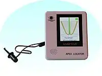 An electronic apex locator is an electronic device used in endodontics to determine the position of the apical constriction and thus determine the length of the root canal space. The apex of the root has a specific resistance to electrical current, and this is measured using a pair of electrodes typically hooked into the lip and attached to an endodontic file.