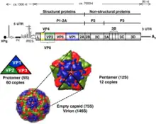 Aphthoviruses are non-enveloped and have an icosahedral capsid with a diameter of around 27 to 30 nm.[2] The assembled viral capsid contains a single copy of the RNA genome and 60 copies of the four viral capsid proteins VP1, VP2, VP3, and VP4. The protomers form the sides of the icosahedral capsid. The VP4 protein is internal.[3]