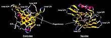The resolved tertiary structure shows that ApoD is composed of 8 anti-parallel β-strands forming a hydrophobic cavity capable of receiving different ligands.[11][12] ApoD also contains 5 cysteine residues, 4 of which are involved in intra-molecular disulfide bonds.
