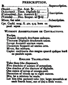 Until around 1900, medical prescriptions and most European pharmacopoeias were written in Latin. Here is a typical example from the middle of the 19th century.[46]