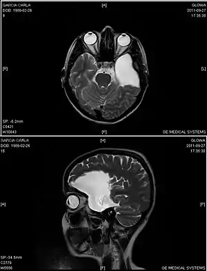 Arachnoid cysts are cerebrospinal fluid covered by arachnoidal cells and collagen[1] that may develop between the surface of the brain and the cranial base or on the arachnoid membrane, one of the three meningeal layers that cover the brain and the spinal cord.[2] Primary arachnoid cysts are a congenital disorder whereas secondary arachnoid cysts are the result of head injury or trauma.[3] Most cases of primary cysts begin during infancy; however, onset may be delayed until adolescence.[2]