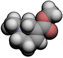 Arecoline is a base, and its conjugate acid has a pKa ~ 6.8.[3] Arecoline is volatile in steam, miscible with most organic solvents and water, but extractable from water by ether in presence of dissolved salts. Being basic, arecoline forms salts with acids. The salts are crystalline, but usually deliquescent: the hydrochloride, arecoline•HCl, forms needles, m.p. 158 °C;[3] the hydrobromide, arecoline•HBr, forms slender prisms, mp. 177–179 °C from hot methanol; the aurichloride, arecoline•HAuCl4, is an oil, but the platinichloride, arecoline2•H2PtCl6, mp. 176 °C, crystallizes from water in orange-red rhombohedrons. The methiodide forms glancing prisms, mp. 173-174 °C.