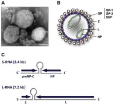 The S-segment RNA is approximately 3.5 kb, and encodes the viral nucleocapsid protein (NP) and glycoprotein (GPC).[24] The L-segment RNA is approximately 7.2 kb, and encodes the viral RNA-dependent RNA-polymerase (L) and a small RING-domain containing protein (Z).[25][26][27]