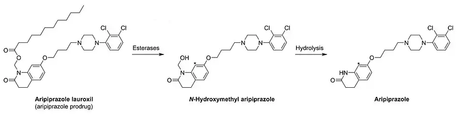 In contrast to many other depot antipsychotics, aripiprazole lauroxil is described as a non-ester chemical modification.[27] It is specifically N-lauroyloxymethylaripiprazole.[27] However, the N-lauroyloxymethyl moiety contains a laurate ester, technically making aripiprazole lauroxil an antipsychotic ester.[28] More specifically, aripiprazole lauroxil is the laurate ester of N-hydroxymethylaripiprazole.[3] Following cleavage of the laurate ester, N-hydroxymethylaripiprazole is further metabolized to aripiprazole, making aripiprazole lauroxil a prodrug of aripiprazole with N-hydroxymethylaripiprazole as an intermediate.[28][27]