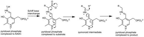 The enzyme uses pyridoxal phosphate (PLP), the active form of vitamin B6, as a cofactor. PLP is essential to the mechanism of decarboxylation in AADC. In the active enzyme, PLP is bound to lysine-303 of AADC as a Schiff base. Upon substrate binding, Lys-303 is displaced by the substrate's amine. This positions the carboxylate of the substrate within the active site such that decarboxylation is favored. Decarboxylation of the substrate produces a quinonoid intermediate, which is subsequently protonated to produce a Schiff base adduct of PLP and the decarboxylated product. Lys-303 can then regenerate the original Schiff base, releasing the product while retaining PLP.[2]