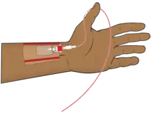 An arterial line is usually inserted into the radial artery in the wrist, but can also be inserted into the brachial artery at the elbow, into the femoral artery in the groin, into the dorsalis pedis artery in the foot, or into the ulnar artery in the wrist.[2] A golden rule is that there has to be collateral circulation to the area affected by the chosen artery, so that peripheral circulation is maintained by another artery even if circulation is disturbed in the cannulated artery.[3]