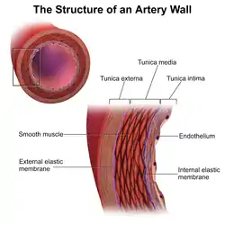 The outermost layer of an artery (or vein) is known as the tunica externa, also known as tunica adventitia, and is composed of collagen fibers and elastic tissue - with the largest arteries containing vasa vasorum (small blood vessels that supply large blood vessels).[2] Most of the layers have a clear boundary between them, however the tunica externa has a boundary that is ill-defined. Normally its boundary is considered when it meets or touches the connective tissue.[3] Inside this layer is the tunica media, or media, which is made up of smooth muscle cells, elastic tissue (also called connective tissue proper) and collagen fibres.[2] The innermost layer, which is in direct contact with the flow of blood, is the tunica intima, commonly called the intima. The elastic tissue allows the artery to bend and fit through places in the body. This layer is mainly made up of endothelial cells (and a supporting layer of elastin rich collagen in elastic arteries). The hollow internal cavity in which the blood flows is called the lumen.