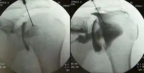 Shoulder arthrography can be used to study tears of the rotator cuff, glenoid labrum and biceps.[2] The type of contrast injected into the joint depends on the subsequent imaging that is planned. For pneumoarthrography, gas is used, for CT or radiographs, a water-soluble radiopaque contrast, and for MRI, gadolinium. Double-contrast arthrography can be used for more anatomically complex cases, though its use is relatively infrequent. The needle is radiographically guided into the glenohumeral joint space, after which the patient is evaluated by fluoroscopy, CT or MRI. The gadolinium in the contrast fluid yields a bright signal on T1 weighted images allowing for better evaluation of the joint capsule, the articular surface of the bones and, in particular, the labral cartilage. MR arthrography is most often used in evaluation of the hip and acetabular labrum, of the shoulder rotator cuff and glenoid labrum, and less often in the wrist.[2] Arthrograms can be diagnostic and therapeutic. Therapeutic arthrograms often distend the joint with cortisone and lidocaine, with a common site being the shoulder. Diagnostic arthrograms can be direct, as described above with penetration of the joint, or indirect, by a venous injection of contrast material and delayed imaging with CT or MRI.[2]