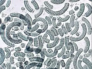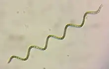 The helical parameters of the shape of Arthrospira is used to differentiate between and even within the same species.[8][9] These differences may be induced by changing environmental conditions, such as temperature.[10] The helical shape of the trichomes is only maintained in a liquid environment.[11] The filaments are solitary and reproduce by binary fission, and the cells of the trichomes vary in length from 2 to 12 μm and can sometimes reach 16 μm.