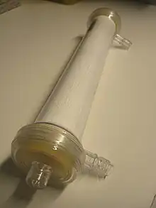 A wearable artificial kidney is a wearable dialysis machine that a person with end-stage kidney disease could use daily or even continuously. A wearable artificial kidney (WAK) is not available, but research teams are in the process of developing such a device. The goal is to develop a portable device that will be able to imitate the functions of the regular kidney. This device would allow for a patient to be treated twenty-four hours a day. With the development of miniature pumps, the hope of an effective wearable hemodialysis device has become realizable. Some patients already receive continuous peritoneal dialysis treatment which allows them to remain ambulatory. However, only a small portion of dialysis patients use peritoneal dialysis treatment because it requires large amounts of dialysate to be stored and disposed. A healthy individual's kidneys filter blood 24 hours/day, 168 hours/week compared to an individual with end-stage renal disease whose dialysis treatment plan is approximately 12 hours a week. The treatment results in a lower quality of life as well as a higher mortality rate for patients with end stage renal disease (ESRD). Therefore, there is a need for an around-the-clock device that will allow ESRD patients to receive dialysis continuously while maintaining a normal life.[14][15][16] The FDA approved the first human clinical trial in the United States for a wearable artificial kidney designed by Blood Purification Technologies Inc. The prototype of the WAK is a 10-pound device, powered by nine-volt batteries, which connects to a patient via a catheter, and should use less than 500mL of dialysate.[14] It is designed to run continuously on batteries, allowing patients to remain ambulatory when wearing the device, leading to a greater quality of life. The device is designed to improve other physiological aspects of the patient's health such as improved volume control, decreased hypertension and sodium retention, as well as a decreased rate of cardiovascular disease and stroke.[14][15][16]