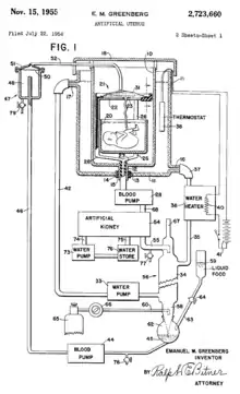 On 22 July 1954 Emanuel M. Greenberg filed a patent on the design for an artificial womb.[20] The patent included two images of the design for an artificial womb. The design itself included a tank to place the fetus filled with amniotic fluid, a machine connecting to the umbilical cord, blood pumps, an artificial kidney, and a water heater. He was granted the patent on 15 November 1955.[20]