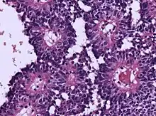 Micrograph of an astroblastoma showing the characteristic nuclear pervivascular pseudorosette. H&E stain. | |