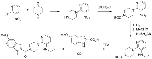 Preparation of the pyridylpiperazine moiety starts by aromatic displacement of chlorine from 2-chloro-3-nitropyridine by piperazine to give 3. The secondary amine is then protected as its BOC derivative by reaction with di-tert-butyl dicarbonate (Boc anhydride) to give 4. The nitro group is then reduced by catalytic hydrogenation. Reductive alkylation with acetaldehyde in the presence of lithium cyanoborohydride gives the corresponding N-ethyl derivative. The protecting group is then removed by reaction with TFA. Reaction of the resulting amine with the imidazolide derivative of 5-methoxy-3-indoleacetic acid produces the amide reverse transcriptase inhibitor, atevirdine.